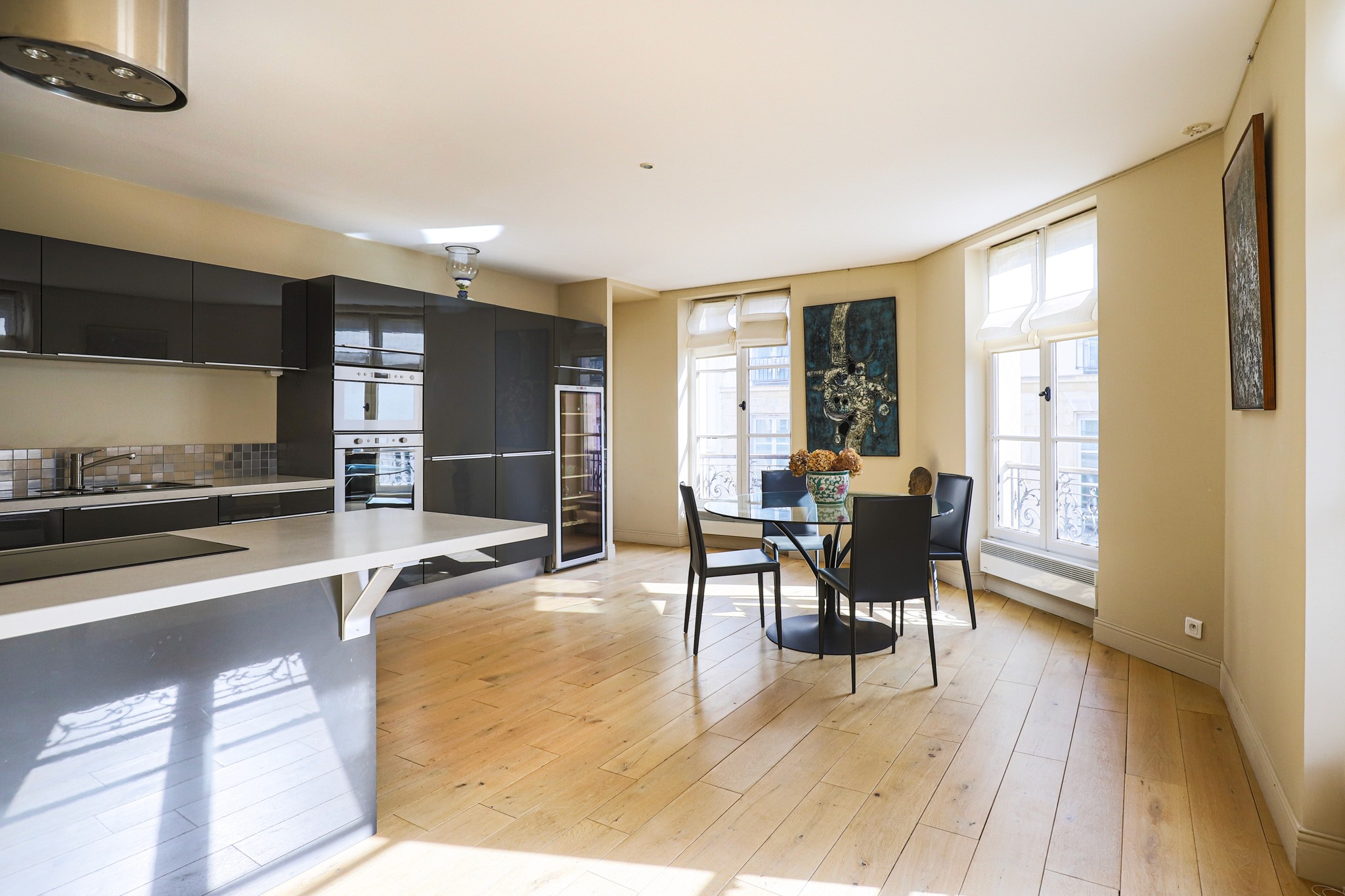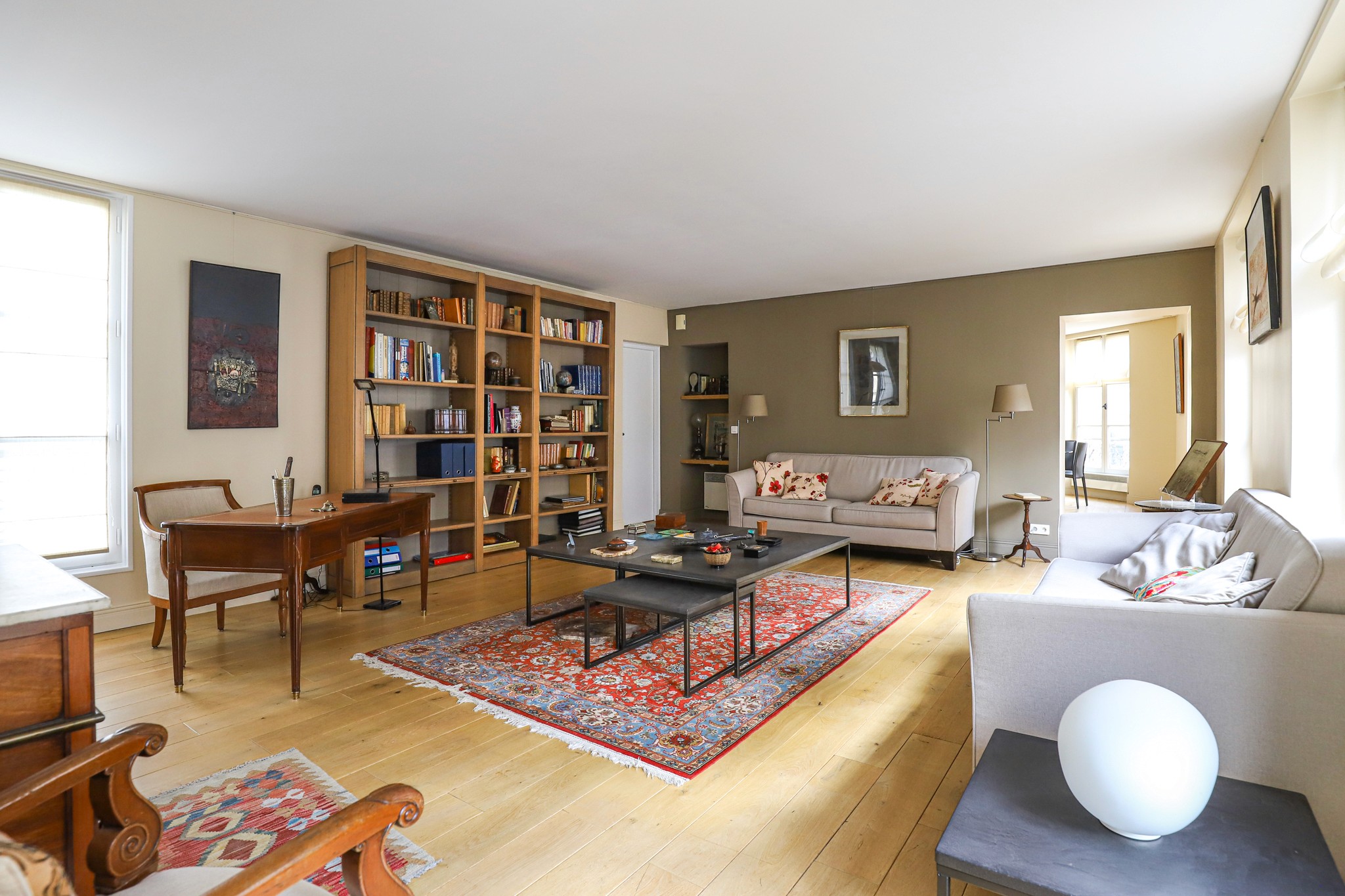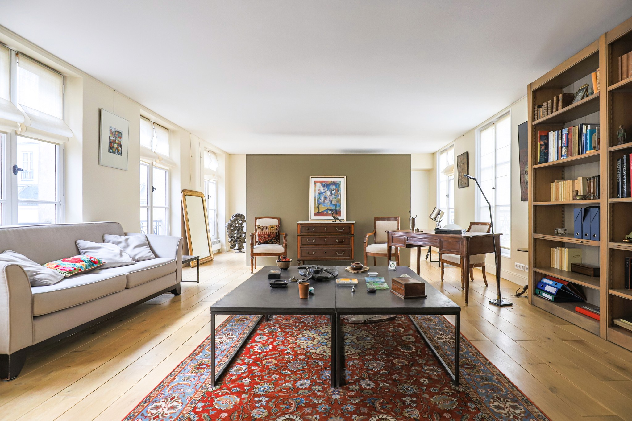 Au cœur du Marais, au troisième étage avec ascenseur d’un bel immeuble avec gardien, cet appartement de 134,7 m² Loi Carrez séduit par ses volumes et sa luminosité.