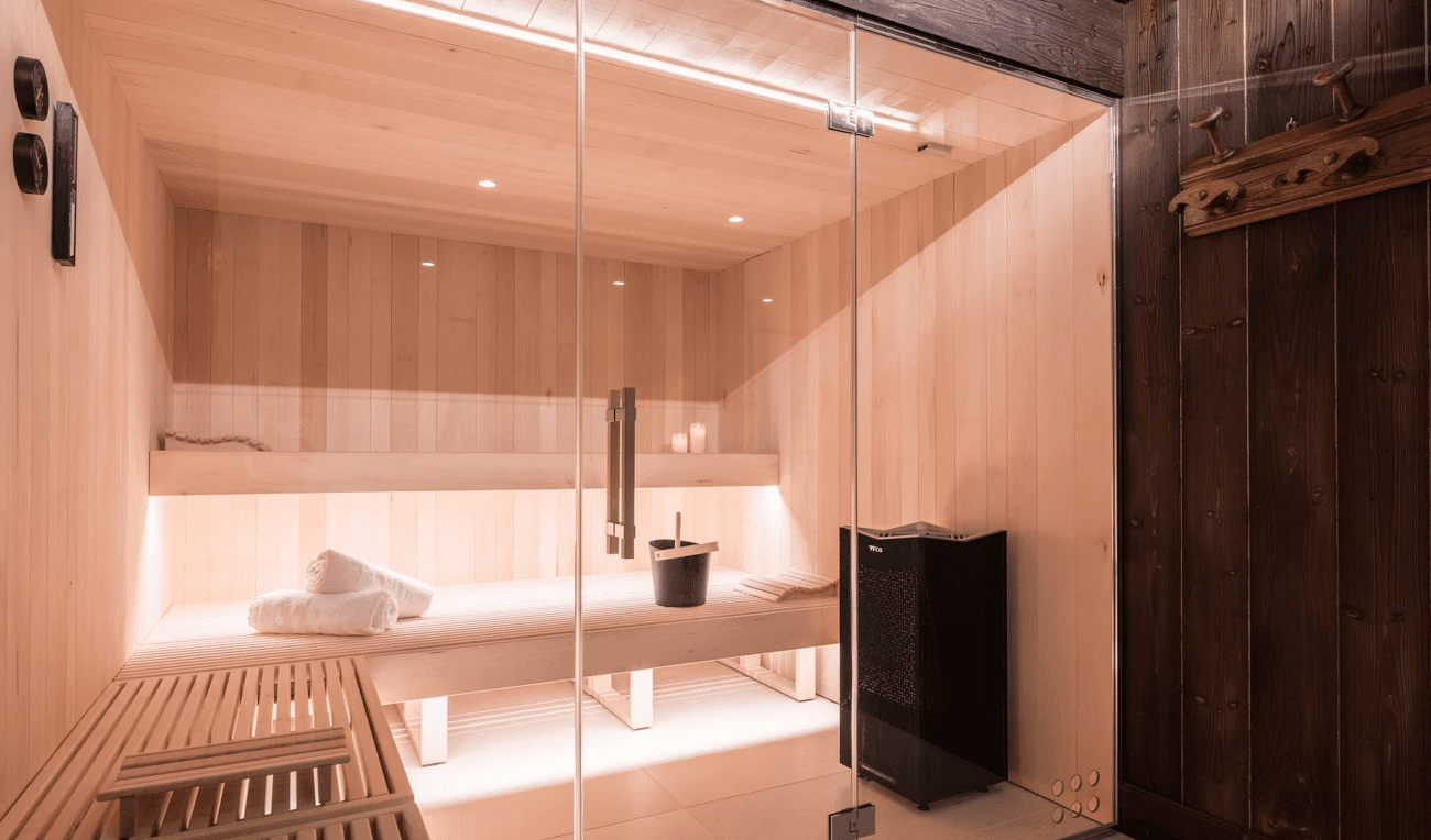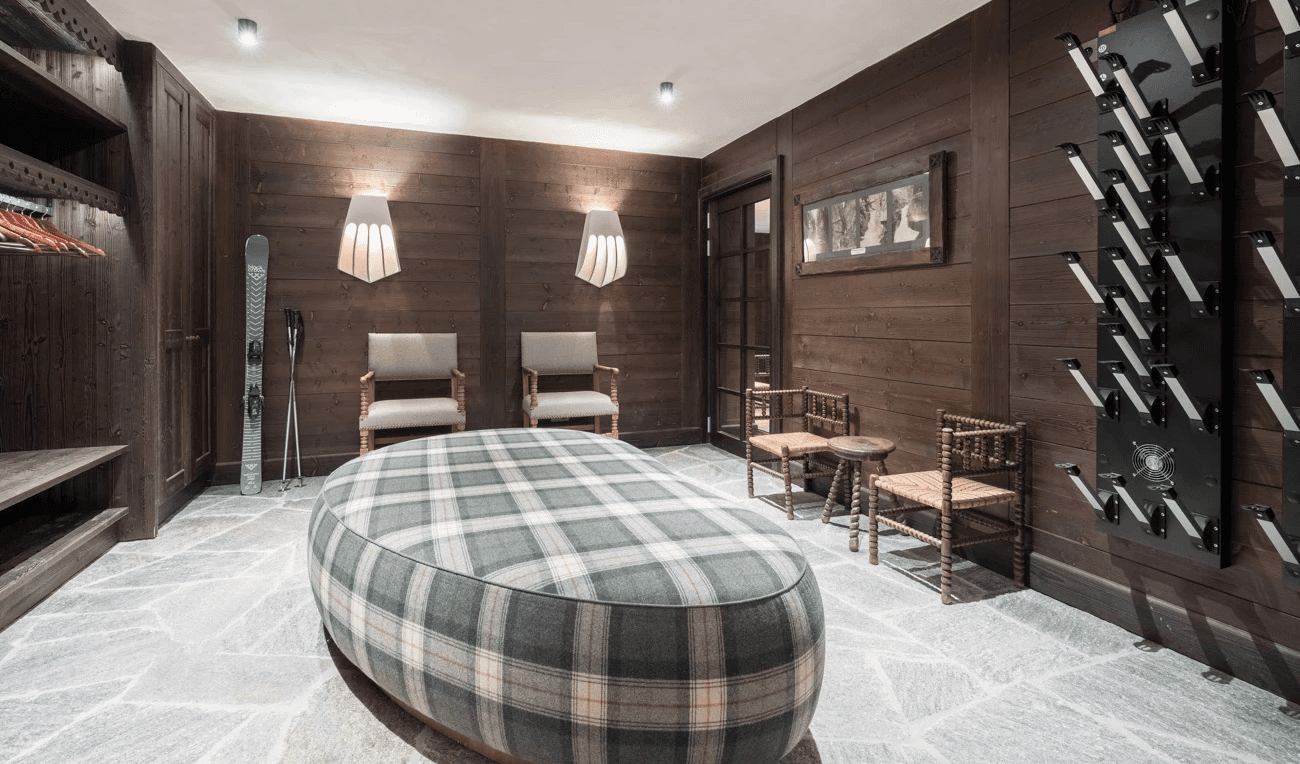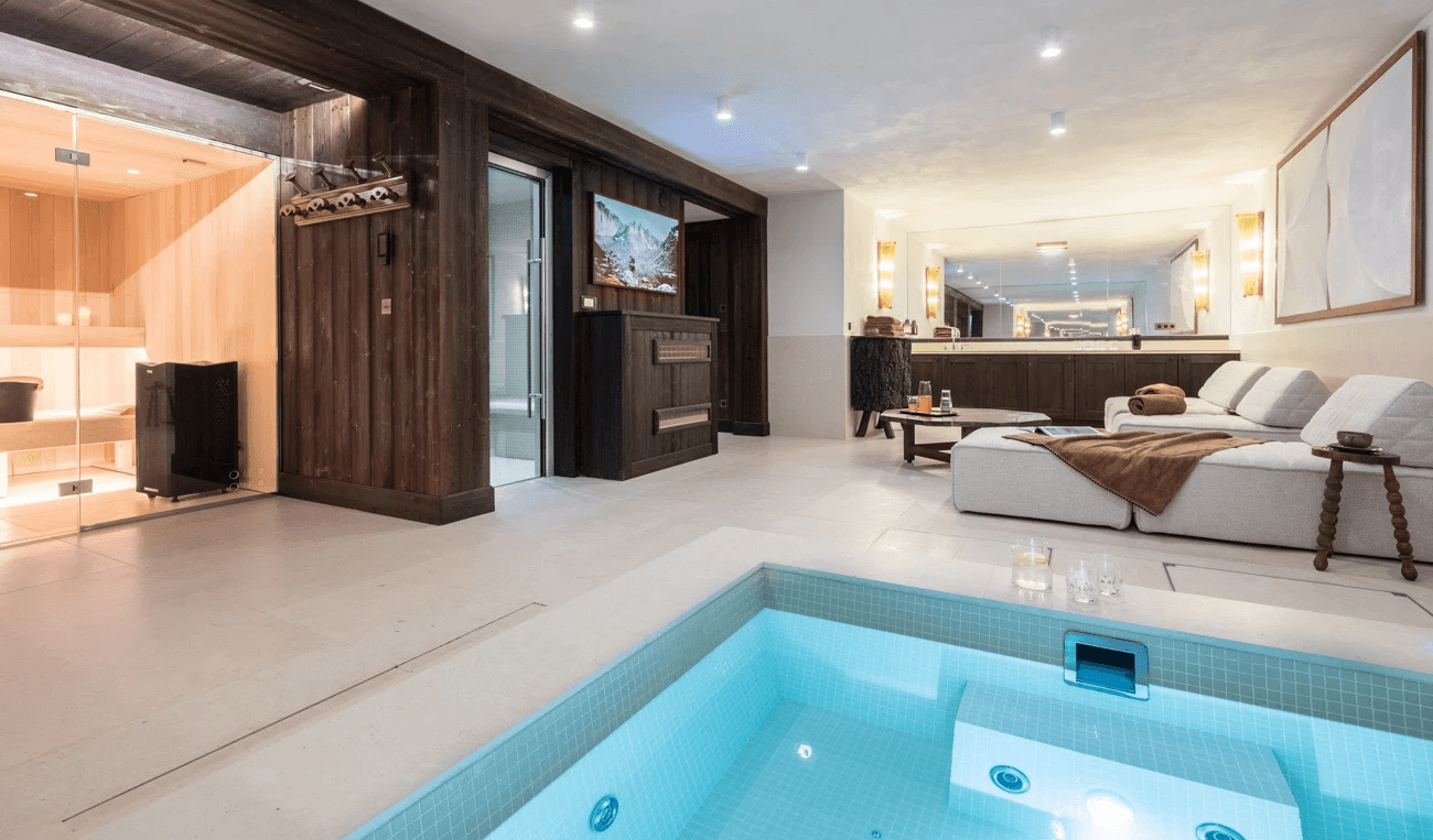 This level opens onto a closed garage that can accommodate two vehicles, extending into a fully equipped ski room designed for practicality and comfort after a day in the mountains. The 70 m² wellness area offers a calming atmosphere with a large indoor jacuzzi for eight people, a sauna, a hammam, and a massage room. A laundry room and guest toilets complete this area, which is connected to all levels of the chalet via an internal elevator.