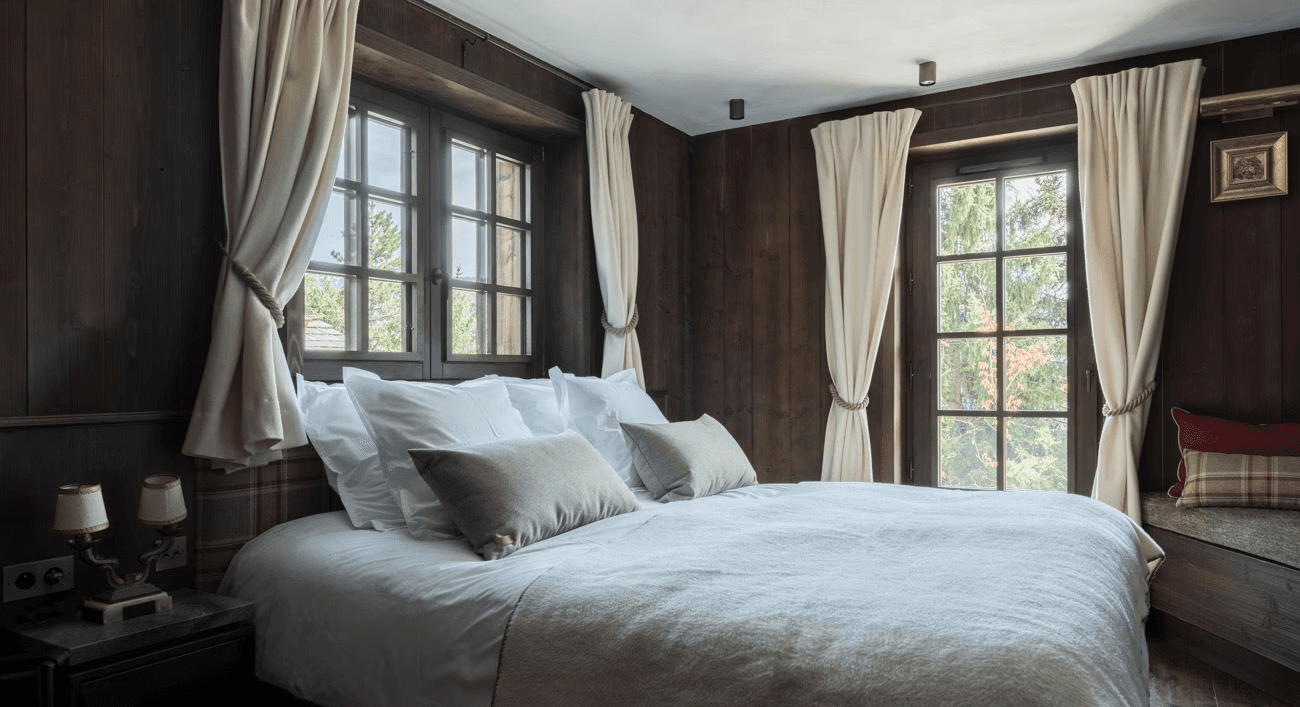 The top level is exclusively dedicated to the master suite. The suite includes a king-size bed, a bathroom with a bathtub, shower, double sink, and toilet, as well as a minibar and a safe. The large openings bathe the room in light and offer a spectacular view of the Mont-Blanc massif.