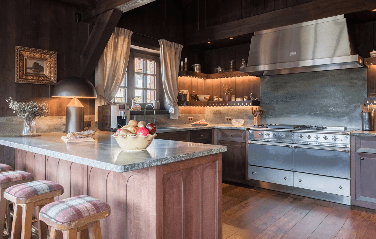 Truly the heart of the chalet, the ground floor revolves around a large living area of 90 m², bathed in light and open to Mont-Blanc. The kitchen, both elegant and functional, is equipped with a semi-professional cooking range, two refrigerators, two dishwashers, a rotisserie, and a wine cellar, providing everything necessary to prepare and share friendly meals. The large dining table accommodates up to sixteen guests in a warm atmosphere, while the living room, centered around a contemporary fireplace, invites relaxation in front of an exceptional panorama.