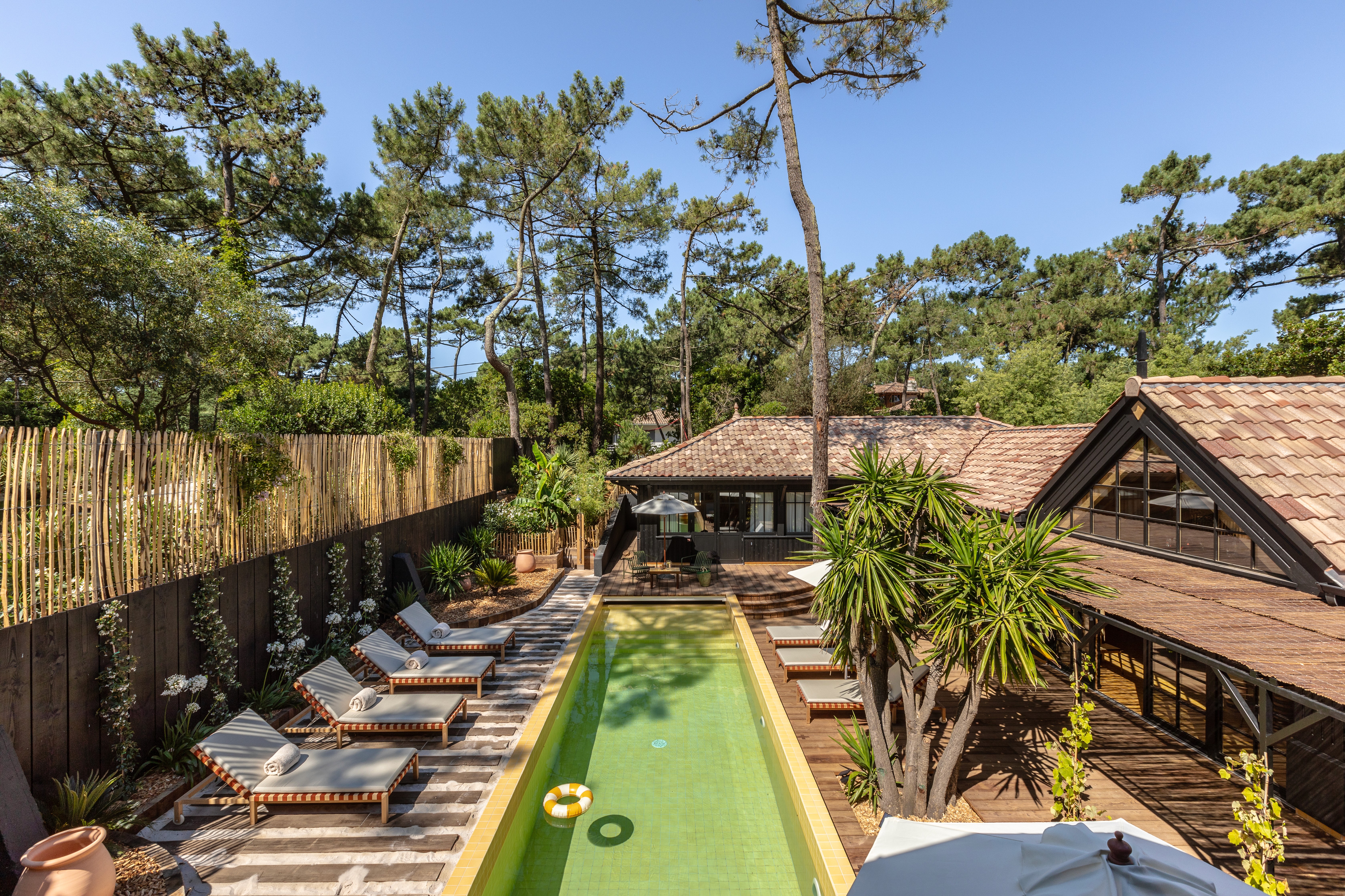 The tangy tones of the sun loungers, pool house, and sheltered terrace are a real invitation to relaxation. A perfectly landscaped exterior signed by Aussih Marseille, each piece created bespoke, vintage, or selected from a sublime choice of designers and creators.
